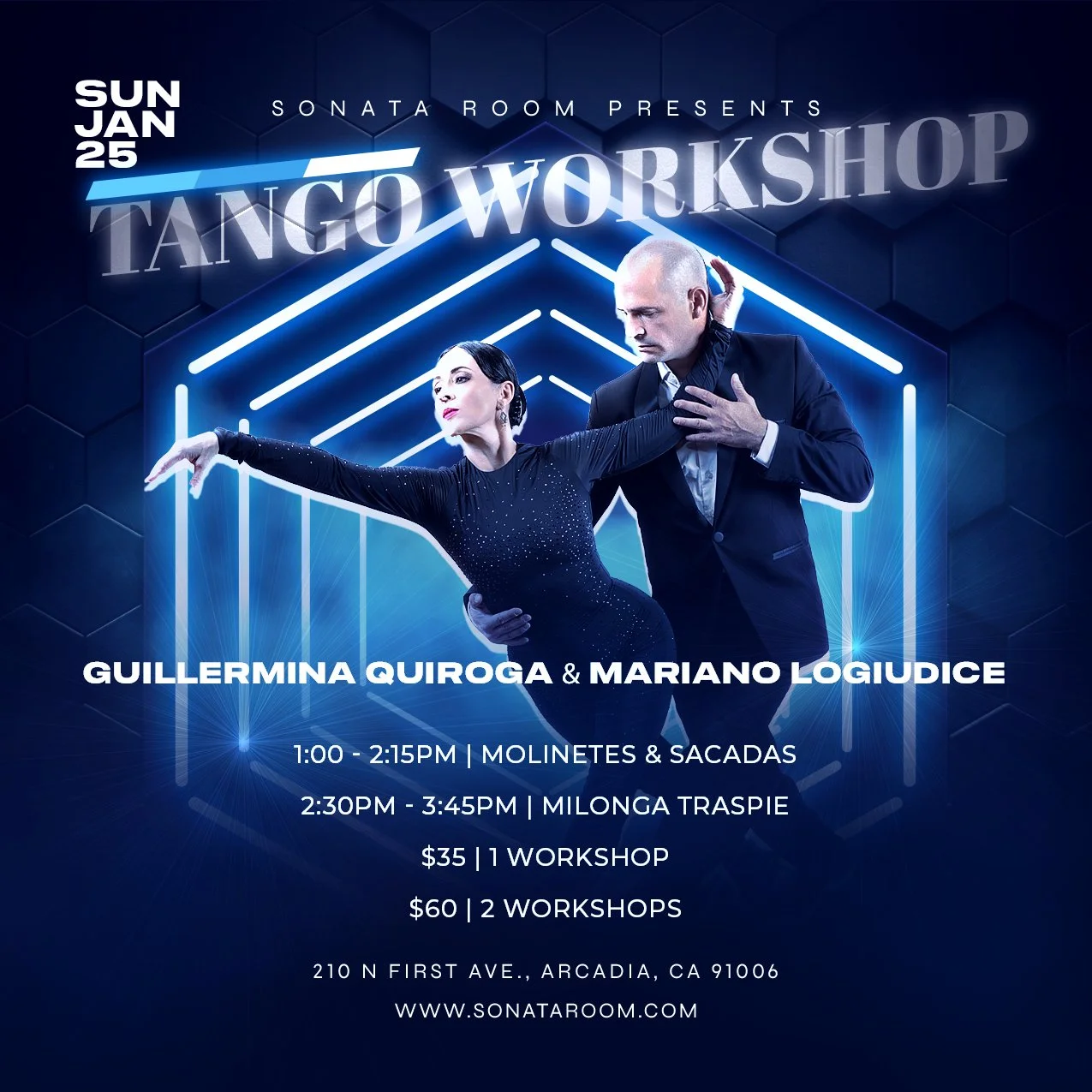 Jan 25 1:00 PM13:00 SUNDAY TANGO WORKSHOPS Sunday, January 25, 2026 1:00 PM 3:45 PM 13:00 15:45 sonataroom@yahoo.com 210 N 1st Ave, Arcadia, CA 91006 (map) Google Calendar ICS View Event →
